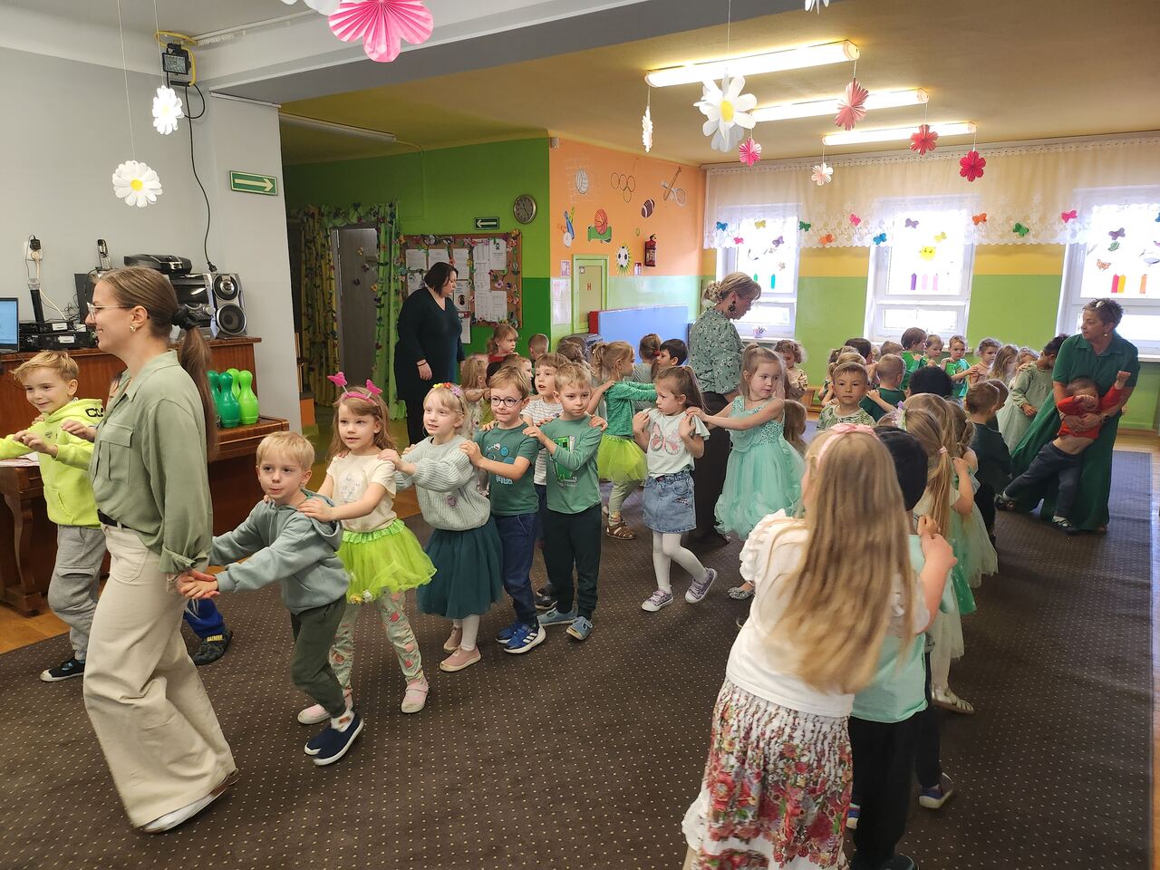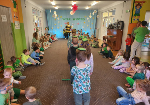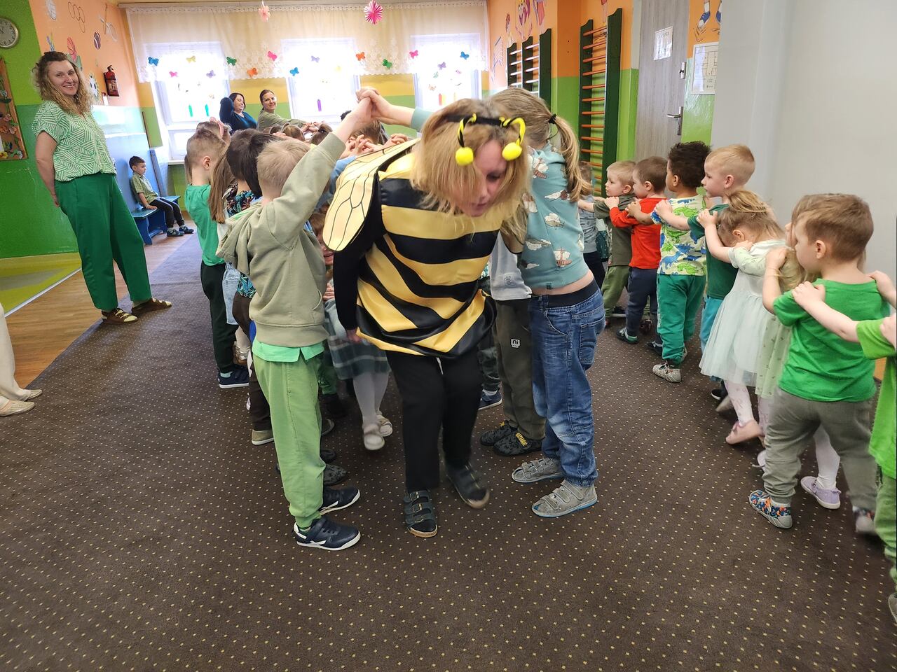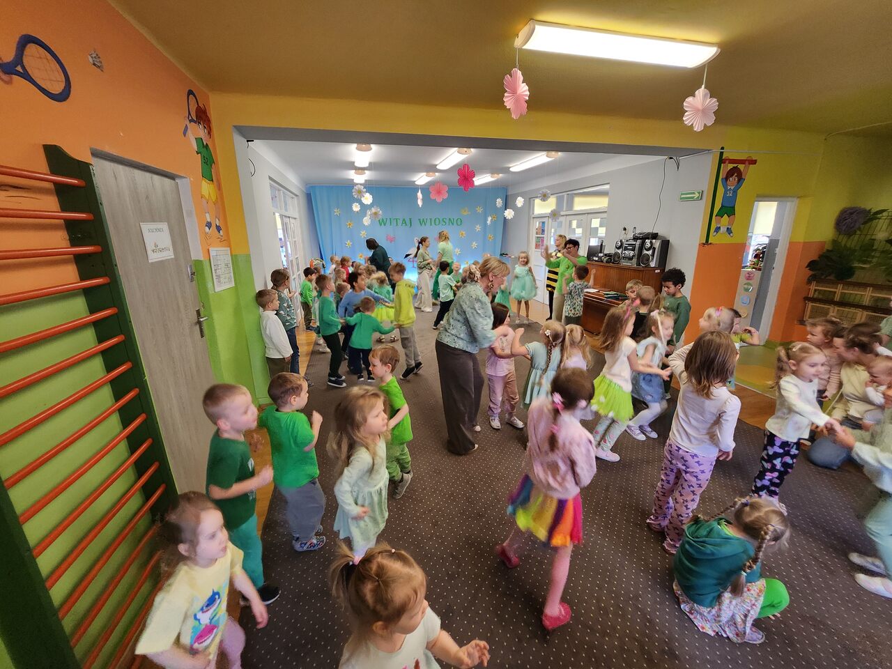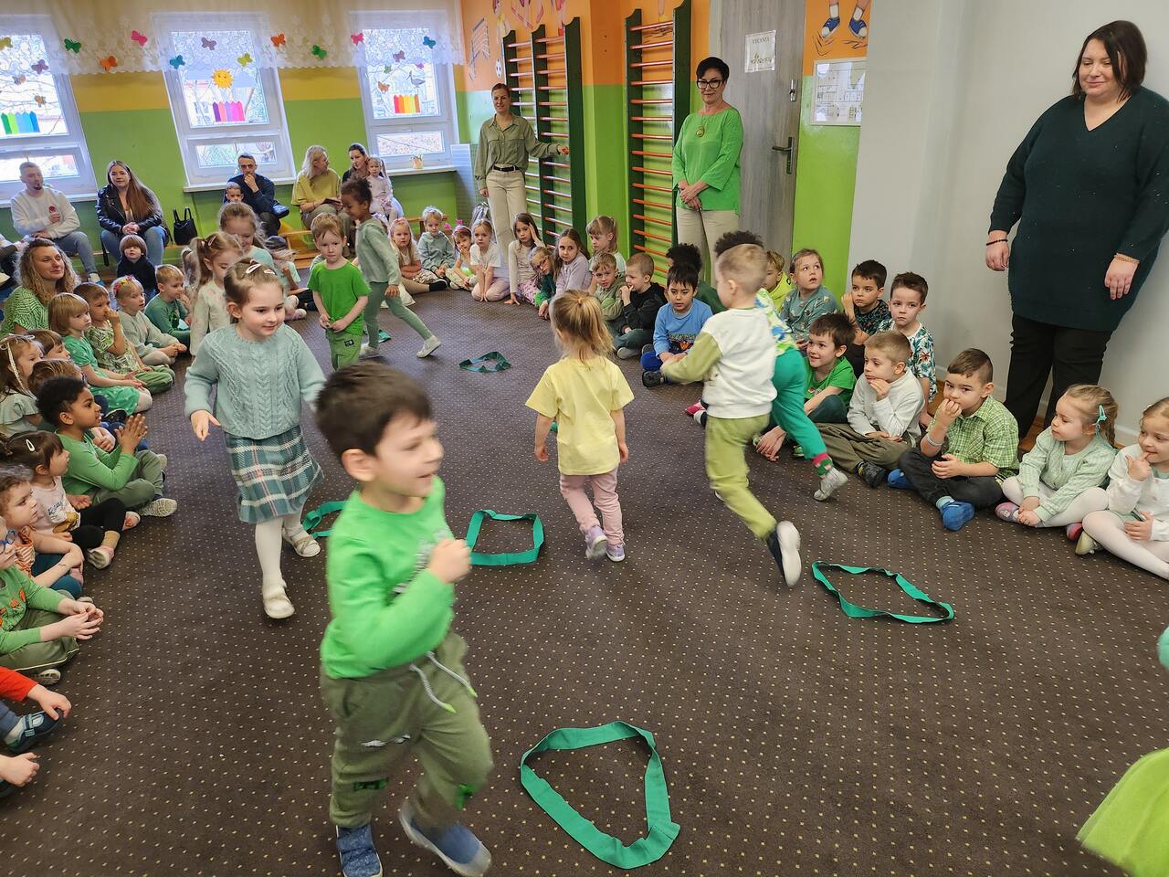 Tego dnia całe Przedszkole wprost zazieleniło i przemieniło w piękną, wiosenną łąkę! Niemal wszystkie dzieci przyszły ubrane na zielone! Zaraz po śniadaniu- wiosennych kanapeczkach- spotkaliśmy się na sali gimnastycznej, gdzie przy dźwiękach wesołej muzyki powitaliśmy najpiękniejszą porę roku- wiosnę. Ciocia Agnieszka przemieniła się w pszczółkę i porwała wszystkie przedszkolaki do zabawy! Dla każdej z grup przygotowała wspaniałe konkursy, dostosowane do wieku dzieci. Nie zabrakło oczywiście wspólnych zabaw i tańców. Po skończonym balu czekało na przedszkolaki pyszne II śniadanie- fantazyjnie ozdobione kanapeczki!