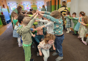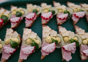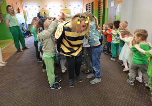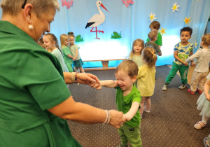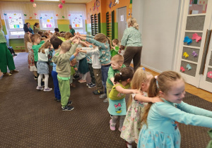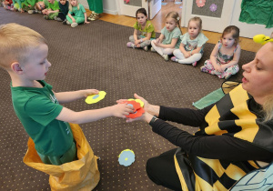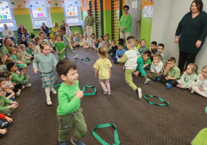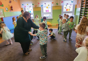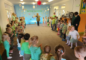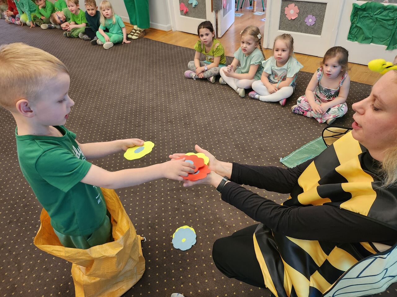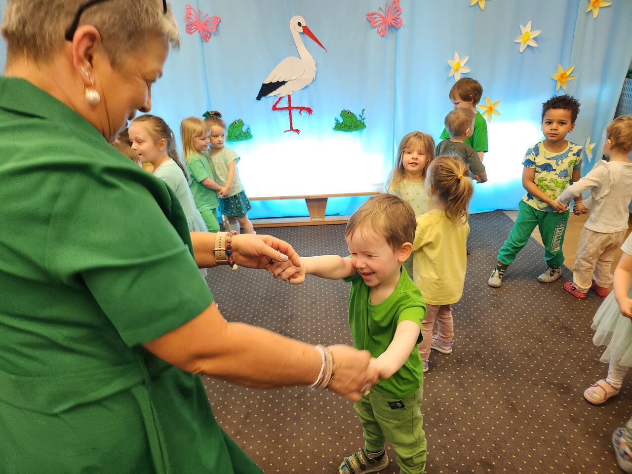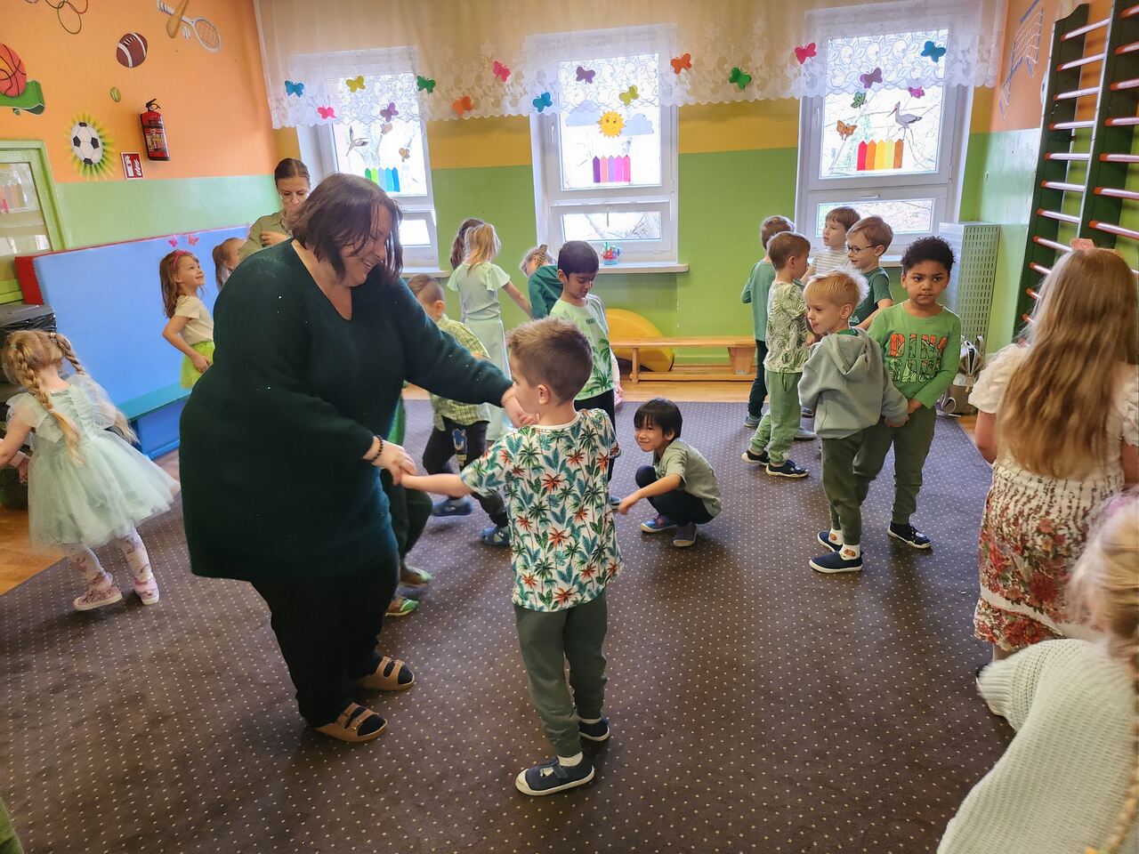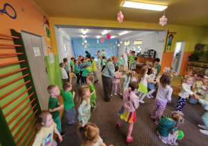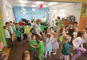 Tego dnia całe Przedszkole wprost zazieleniło i przemieniło w piękną, wiosenną łąkę! Niemal wszystkie dzieci przyszły ubrane na zielone! Zaraz po śniadaniu- wiosennych kanapeczkach- spotkaliśmy się na sali gimnastycznej, gdzie przy dźwiękach wesołej muzyki powitaliśmy najpiękniejszą porę roku- wiosnę. Ciocia Agnieszka przemieniła się w pszczółkę i porwała wszystkie przedszkolaki do zabawy! Dla każdej z grup przygotowała wspaniałe konkursy, dostosowane do wieku dzieci. Nie zabrakło oczywiście wspólnych zabaw i tańców. Po skończonym balu czekało na przedszkolaki pyszne II śniadanie- fantazyjnie ozdobione kanapeczki!