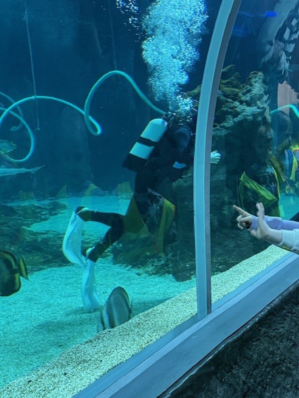 W olbrzymim 26-metrowym akwarium nie mogło zabraknąć morskich stworzeń. Rekinki bambusowe, płaszczki, a nawet rekiny rafowe – to tylko niektórzy mieszkańcy. Przeszklony tunel, przez który przechodziliśmy zafundował niezwykłe uczucie zanurzenia się w morskich głębinach. Tutaj podziwialiśmy życie morskie w całej okazałości – przepływające nad głowami rekiny, kolorowe ryby czy ogromne płaszczki robiły naprawdę niesamowite wrażenie.