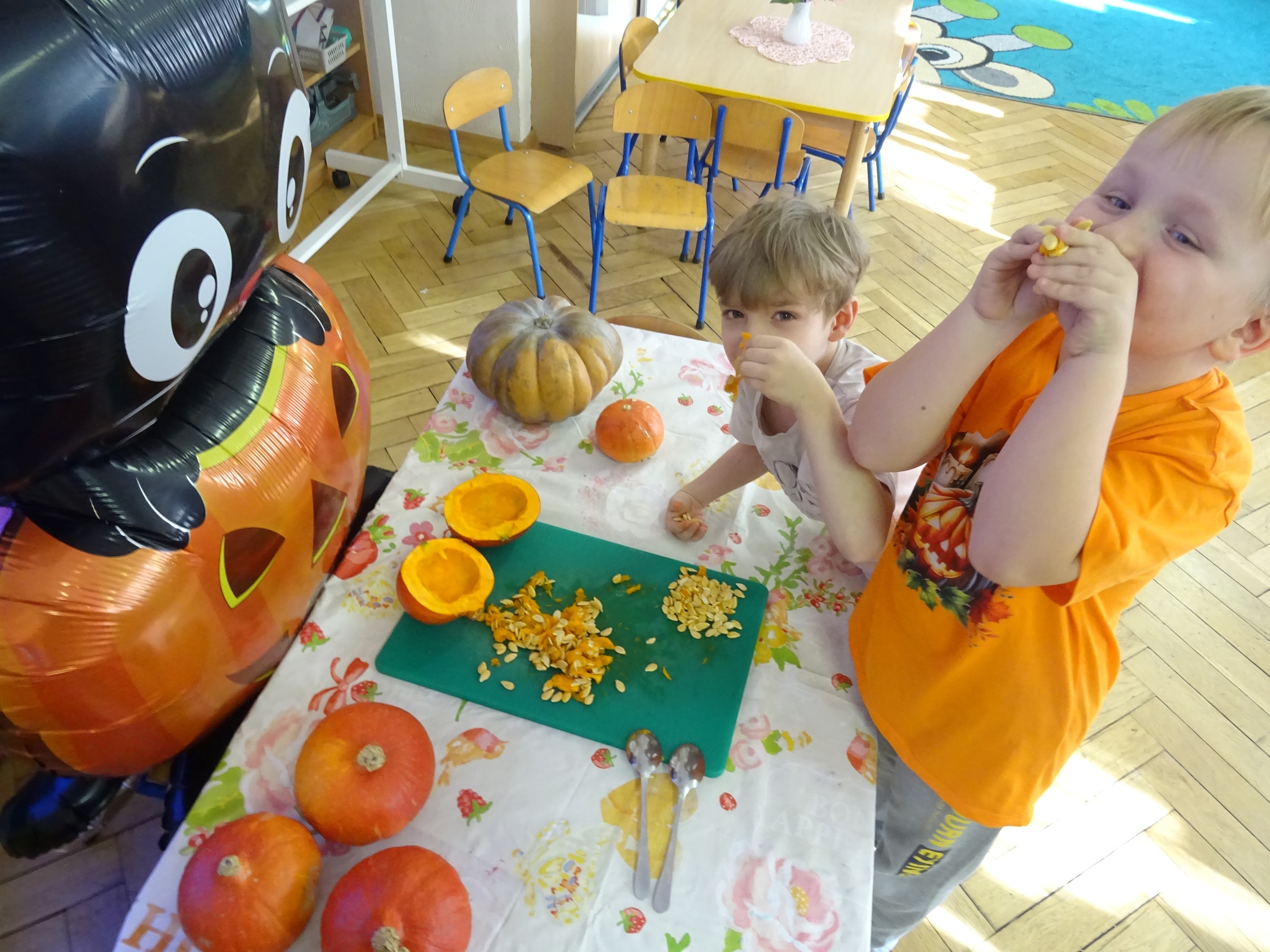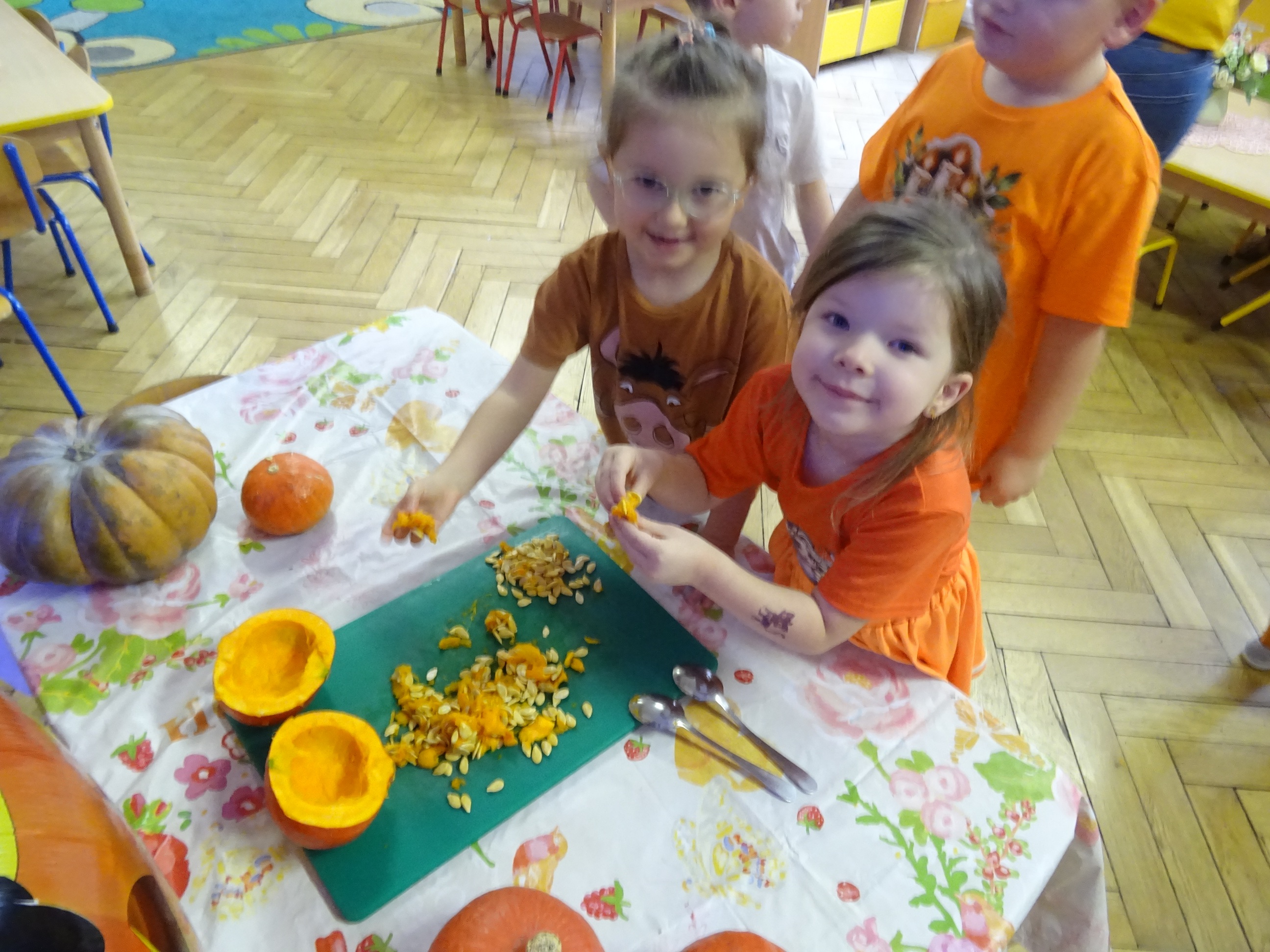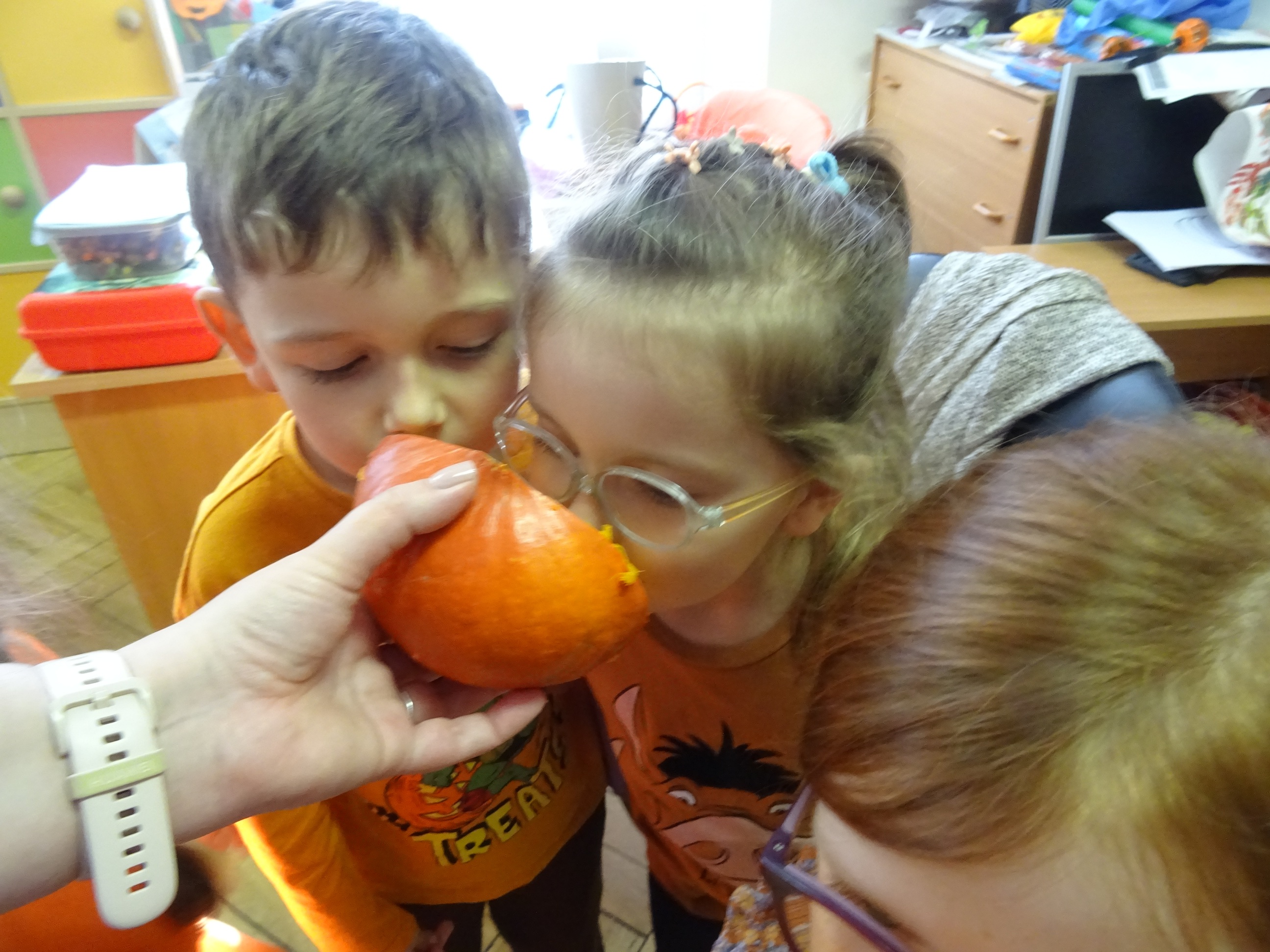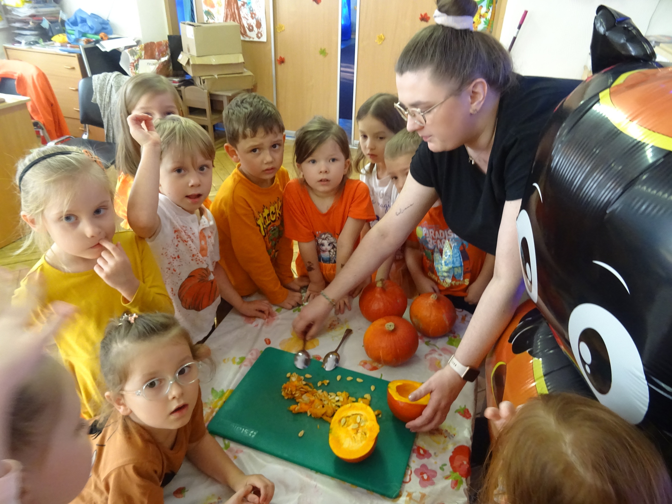 W naszej grupie „Żaczki” obchodziliśmy niezwykle ciekawy Dzień Dyni! Dzieci miały okazję poznać budowę dyni, jej kolor, zapach i wnętrze. Wspólnie oglądaliśmy przekrój dyni, odkrywając, jak wygląda miąższ i pestki. Każdy mógł samodzielnie pobawić się w miękkim miąższu, a także oddzielać pestki od środka dyni. Podczas zajęć rozmawialiśmy również o tym, co można z dyni przygotować – od pysznej zupy po dekoracje jesienne. Odbyły się również poszukiwania dyni pochowanej po sali, a następie samodzielne dekorowanie jej. To był dzień pełen zmysłowych odkryć, zabawy i jesiennego klimatu!