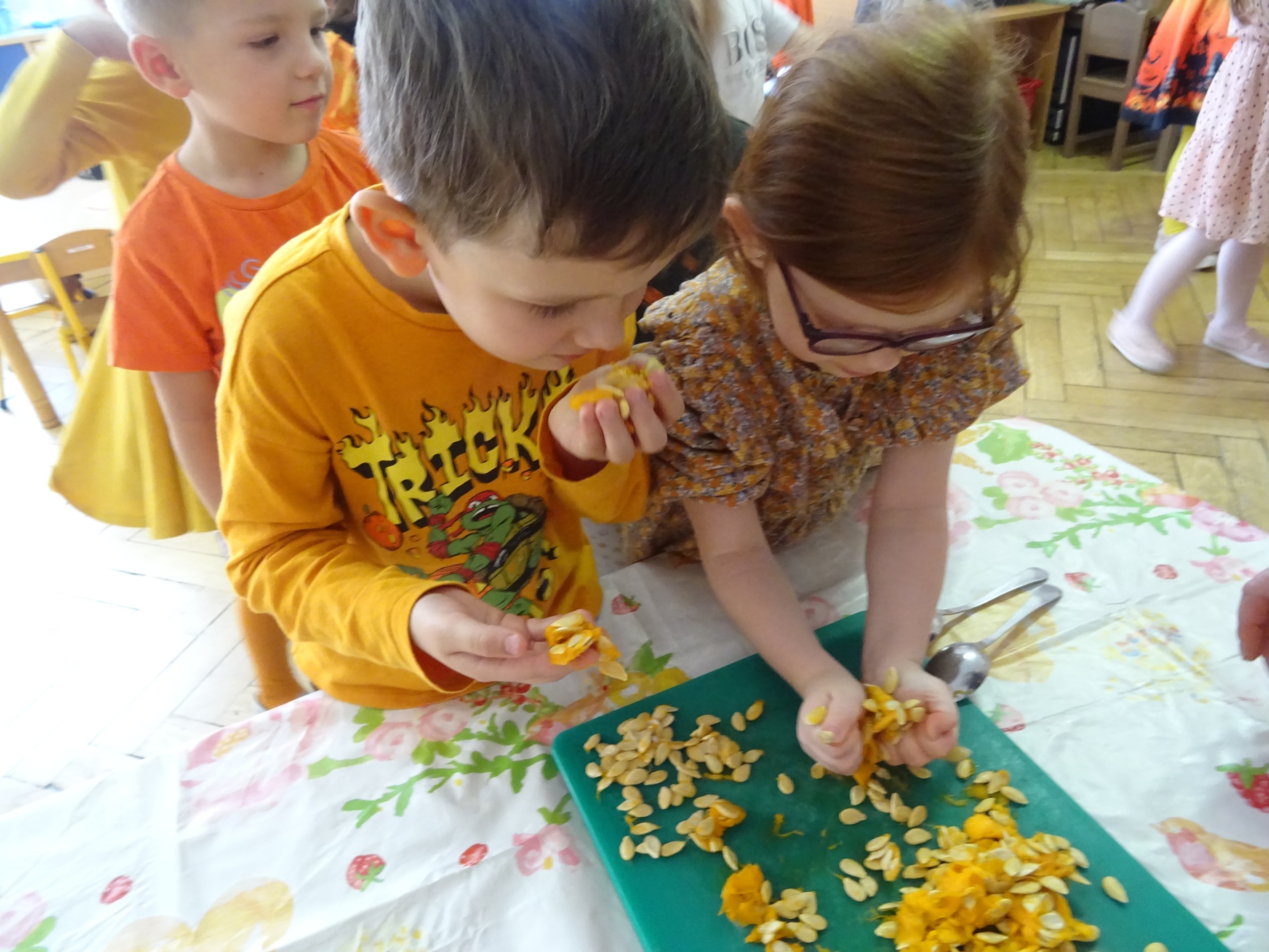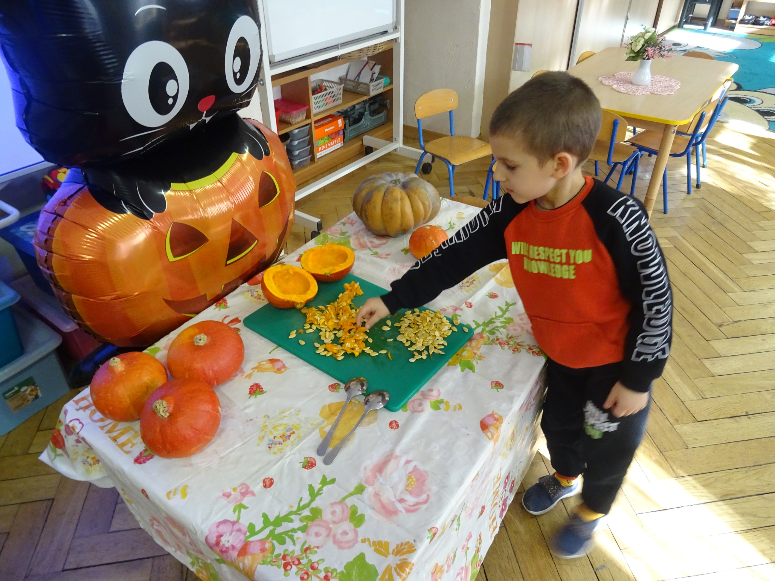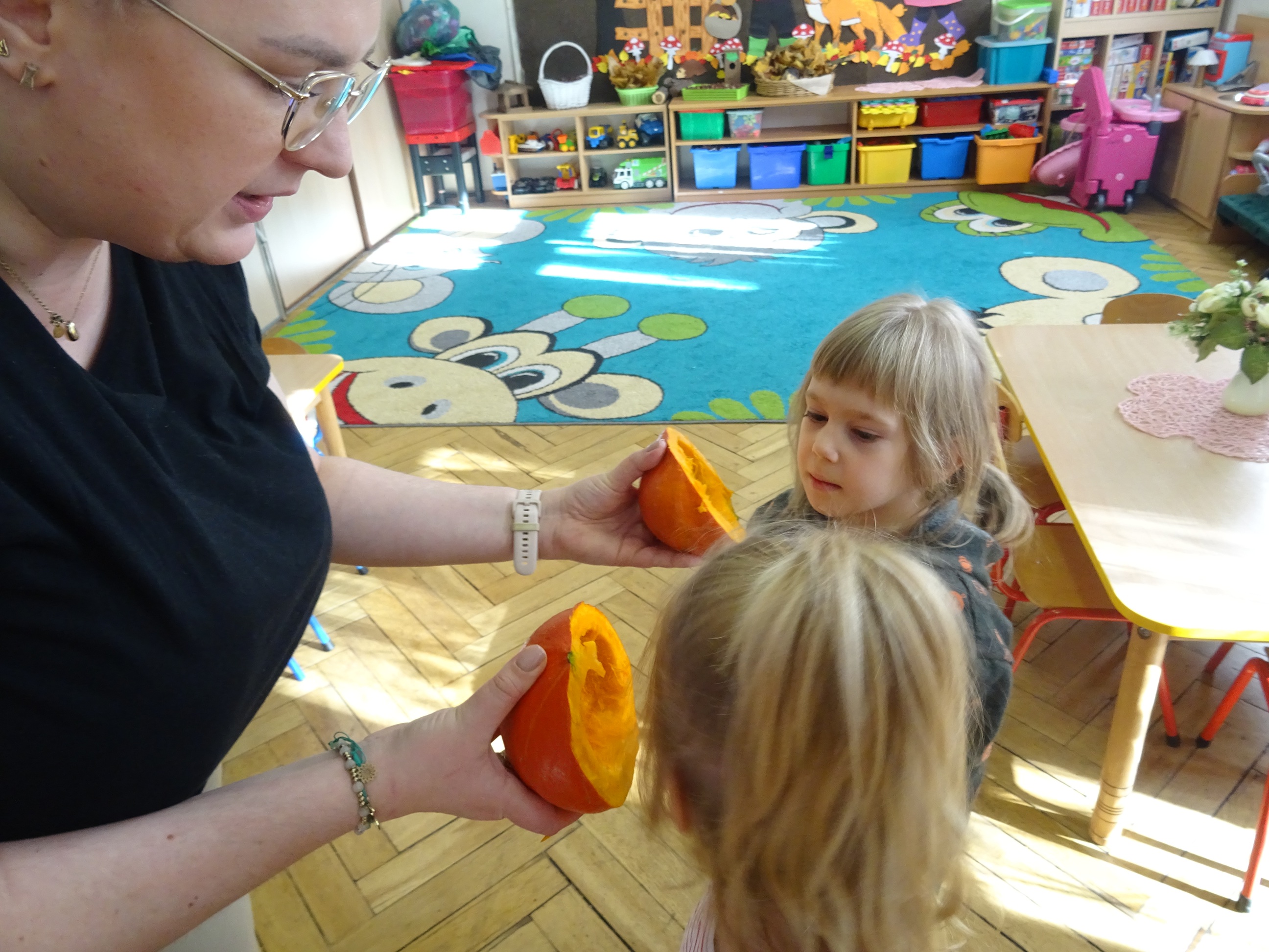 W naszej grupie „Żaczki” obchodziliśmy niezwykle ciekawy Dzień Dyni! Dzieci miały okazję poznać budowę dyni, jej kolor, zapach i wnętrze. Wspólnie oglądaliśmy przekrój dyni, odkrywając, jak wygląda miąższ i pestki. Każdy mógł samodzielnie pobawić się w miękkim miąższu, a także oddzielać pestki od środka dyni. Podczas zajęć rozmawialiśmy również o tym, co można z dyni przygotować – od pysznej zupy po dekoracje jesienne. Odbyły się również poszukiwania dyni pochowanej po sali, a następie samodzielne dekorowanie jej. To był dzień pełen zmysłowych odkryć, zabawy i jesiennego klimatu!