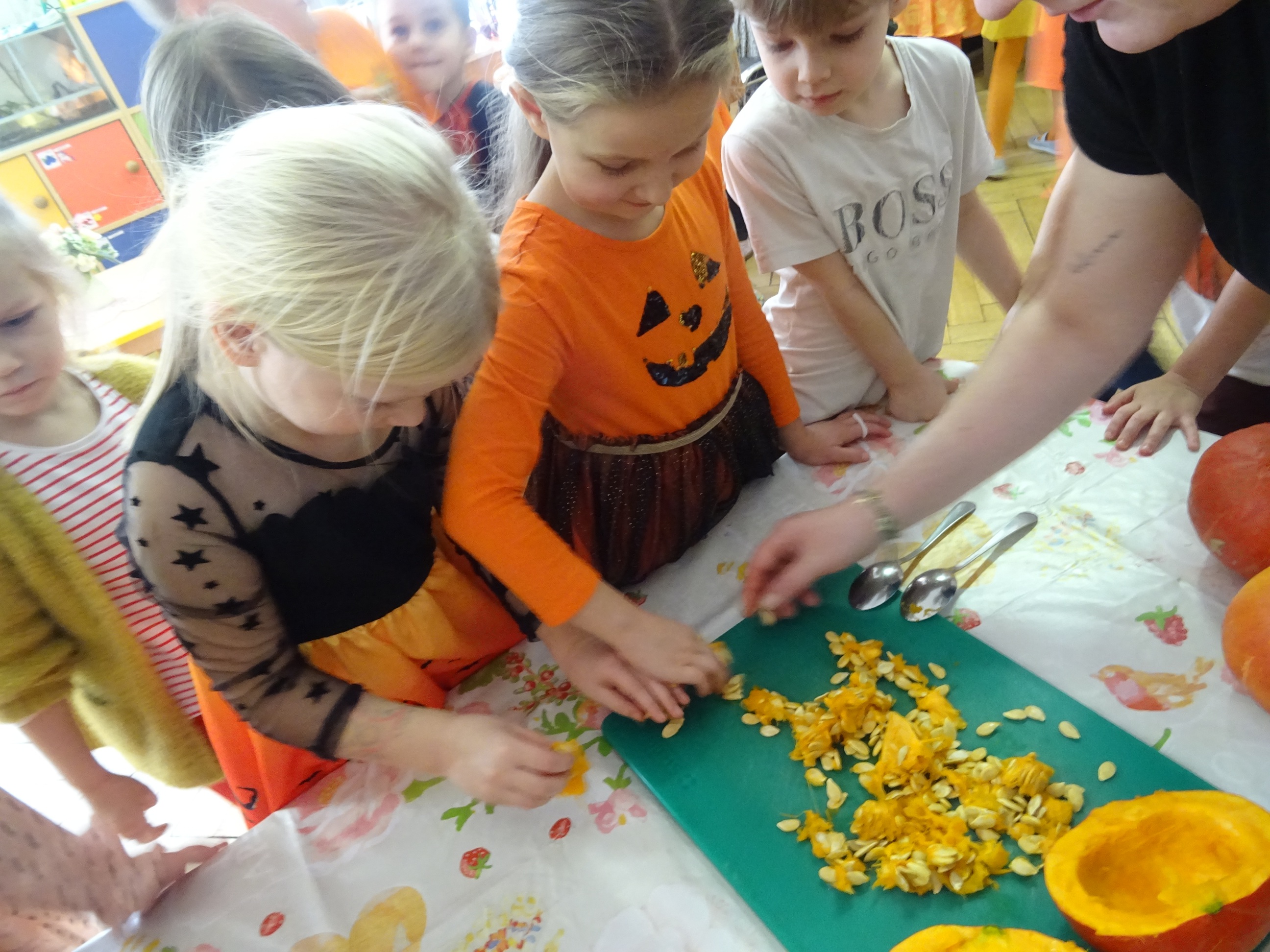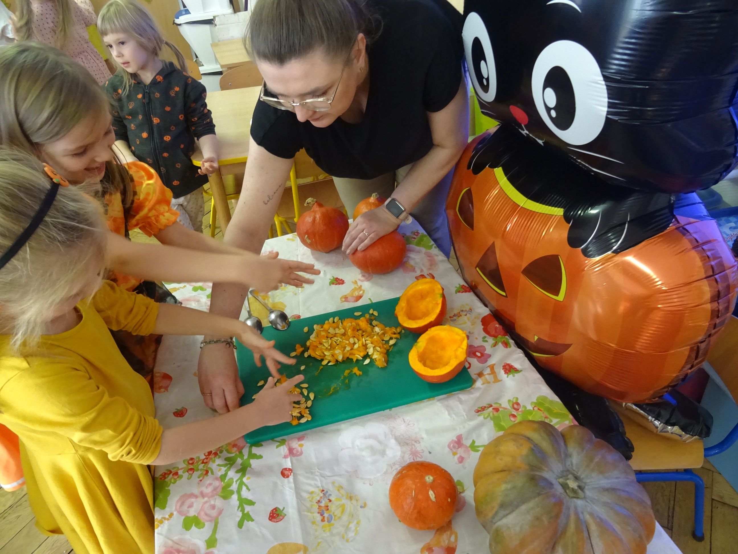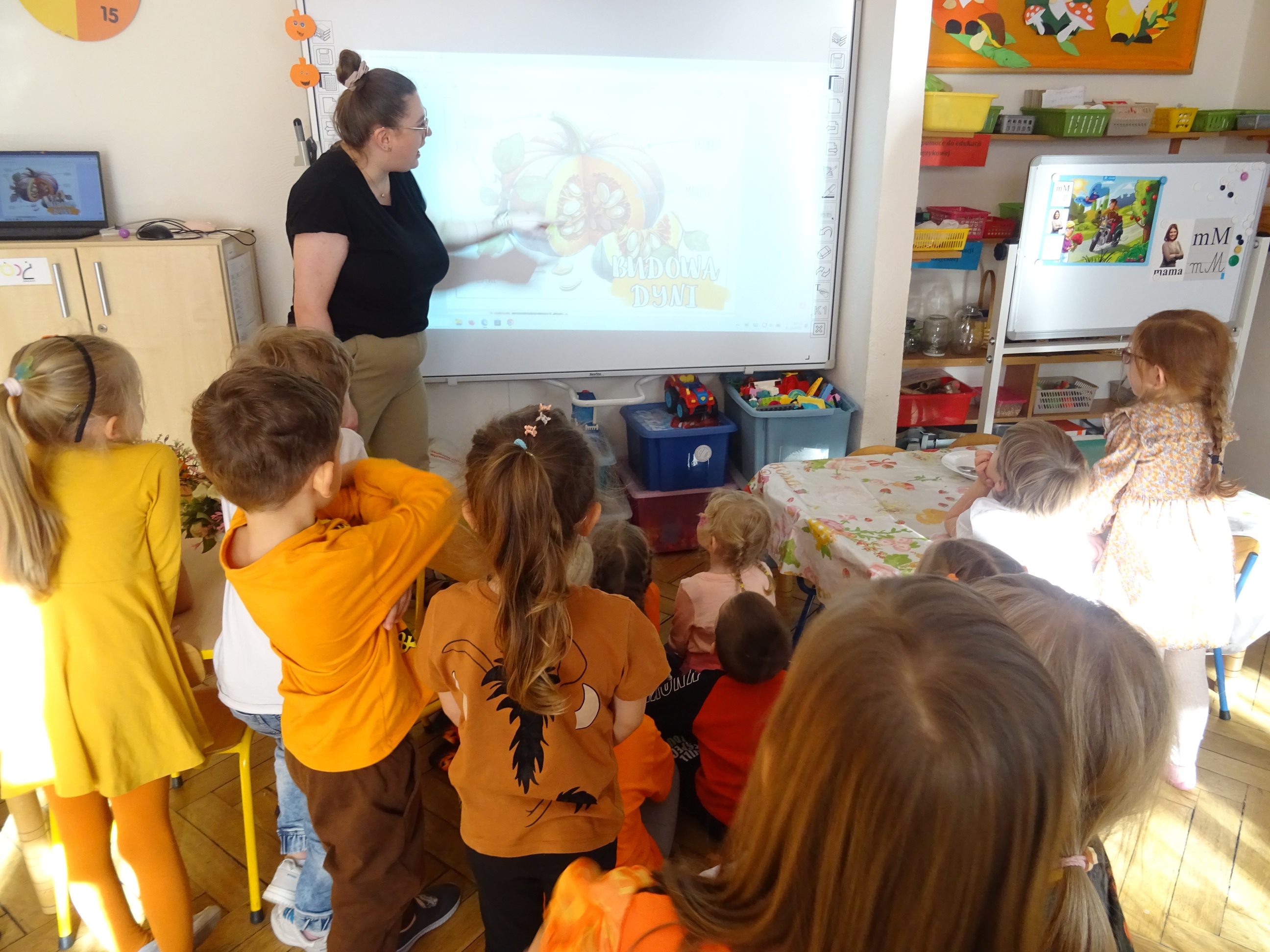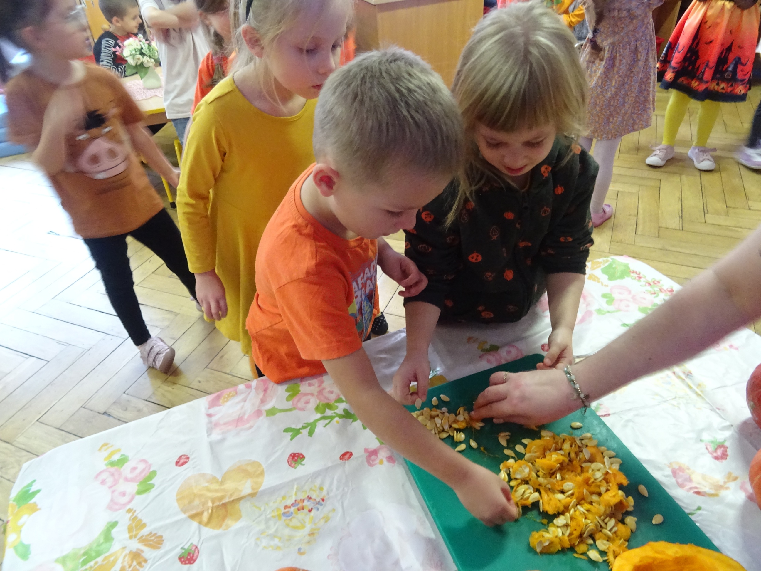 W naszej grupie „Żaczki” obchodziliśmy niezwykle ciekawy Dzień Dyni! Dzieci miały okazję poznać budowę dyni, jej kolor, zapach i wnętrze. Wspólnie oglądaliśmy przekrój dyni, odkrywając, jak wygląda miąższ i pestki. Każdy mógł samodzielnie pobawić się w miękkim miąższu, a także oddzielać pestki od środka dyni. Podczas zajęć rozmawialiśmy również o tym, co można z dyni przygotować – od pysznej zupy po dekoracje jesienne. Odbyły się również poszukiwania dyni pochowanej po sali, a następie samodzielne dekorowanie jej. To był dzień pełen zmysłowych odkryć, zabawy i jesiennego klimatu!