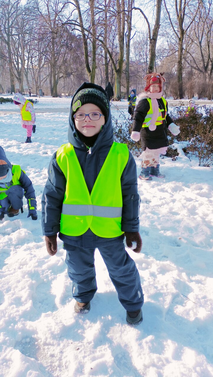 Korzystając z pięknej, słonecznej pogody odwiedziły pobliski park. W trakcie spaceru dzieci przestrzegały wszelkich zasad bezpieczeństwa- maszerowały równo, żwawo, ciesząc oczy niezwykłym, zimowym krajobrazem! W parku wiele radości sprawiły dzieciom zabawy na śniegu, były nawet próby ulepienia bałwana!