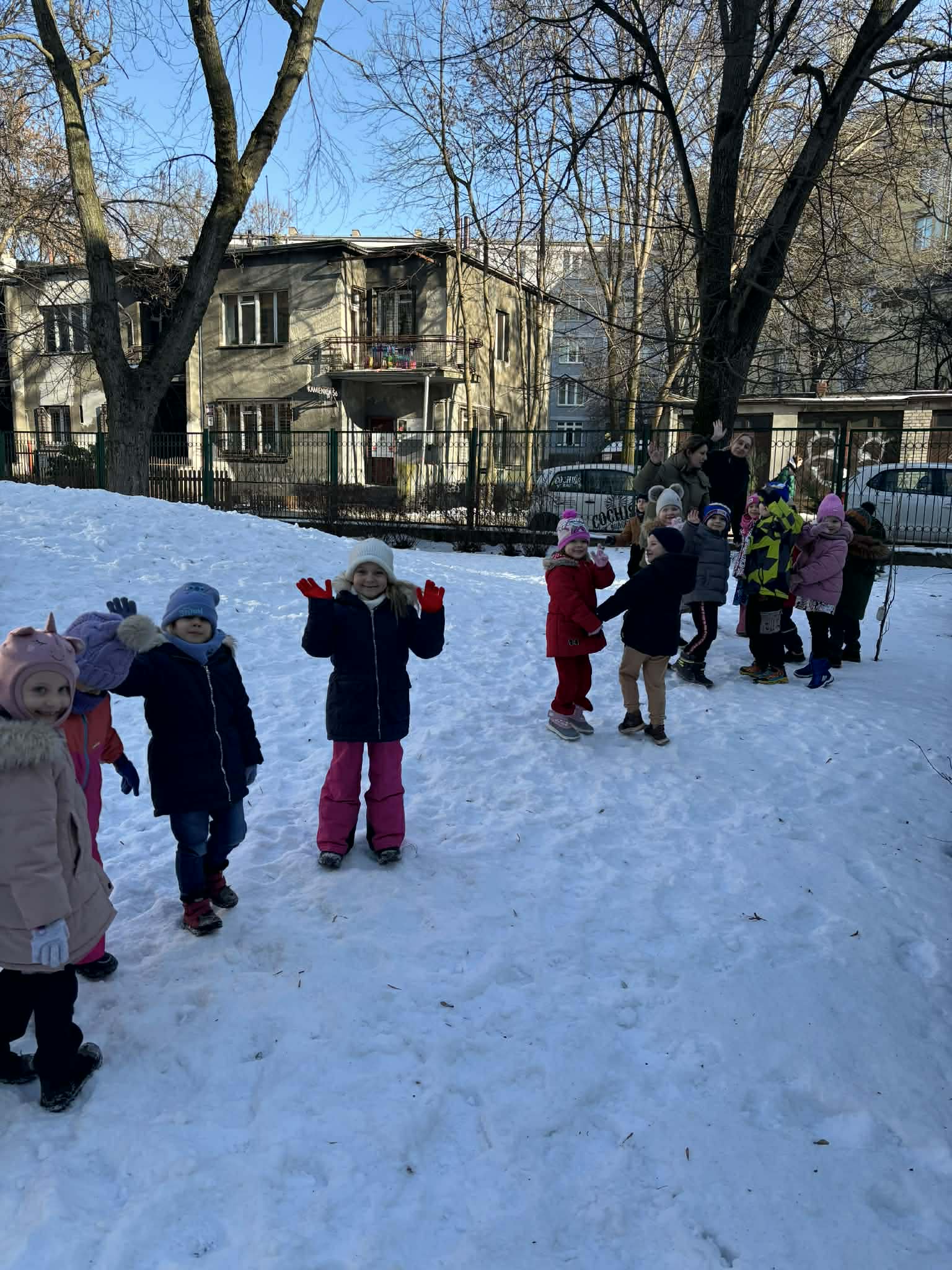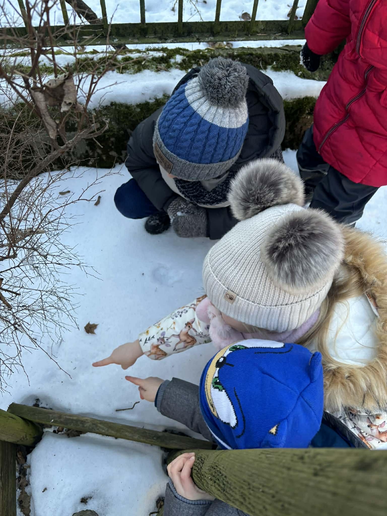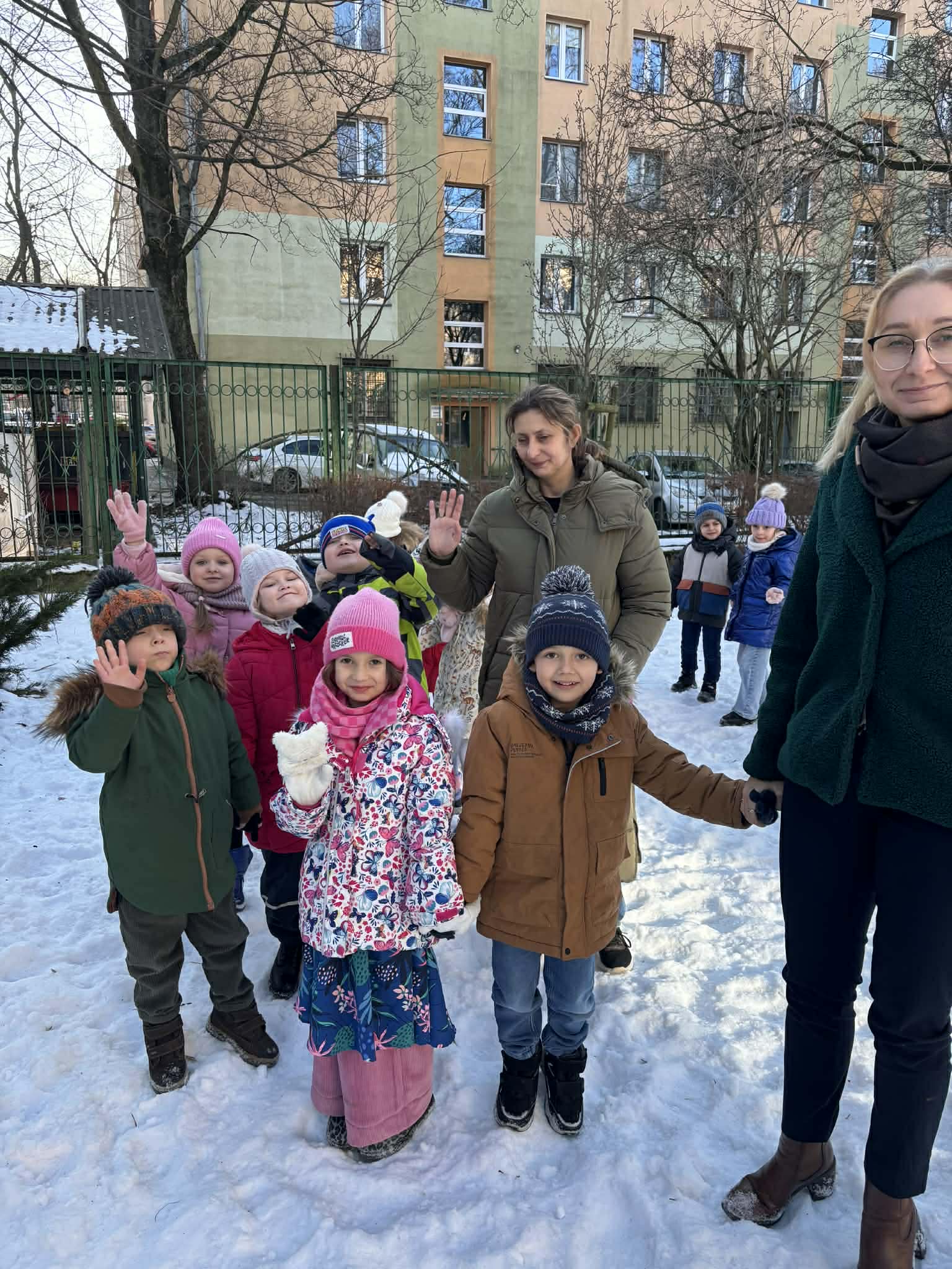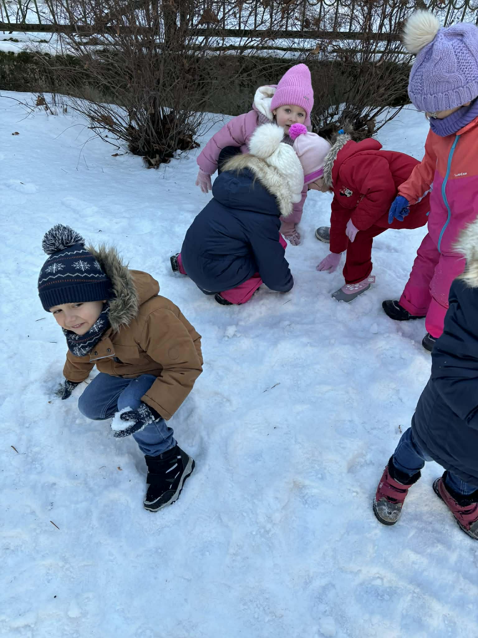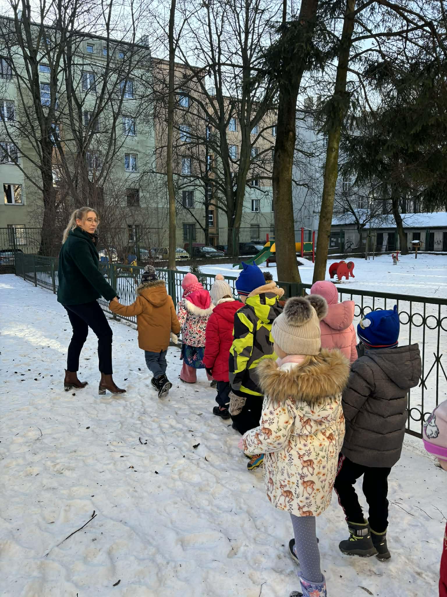 Nasze „Żaczki” wybrały się na pełen przygód spacer po ogrodzie przedszkolnym. Dzieci z zachwytem podziwiały zimowy krajobraz, obserwowały płatki śniegu i błyszczące sople lodu, a pod ich stopami skrzypiał śnieg przy każdym kroku. Mali odkrywcy uważnie poszukiwali śladów zwierząt, sprawdzając, kto odwiedził nasz ogród tej zimy, a także wypatrywali gniazd ptaków schowanych w koronach drzew. Spacer był okazją do bliskiego kontaktu z przyrodą, rozwijania ciekawości świata i radości z odkrywania małych zimowych tajemnic, które kryje ogród przedszkolny.