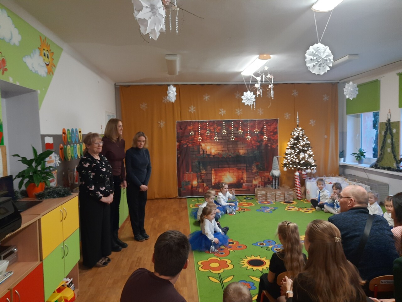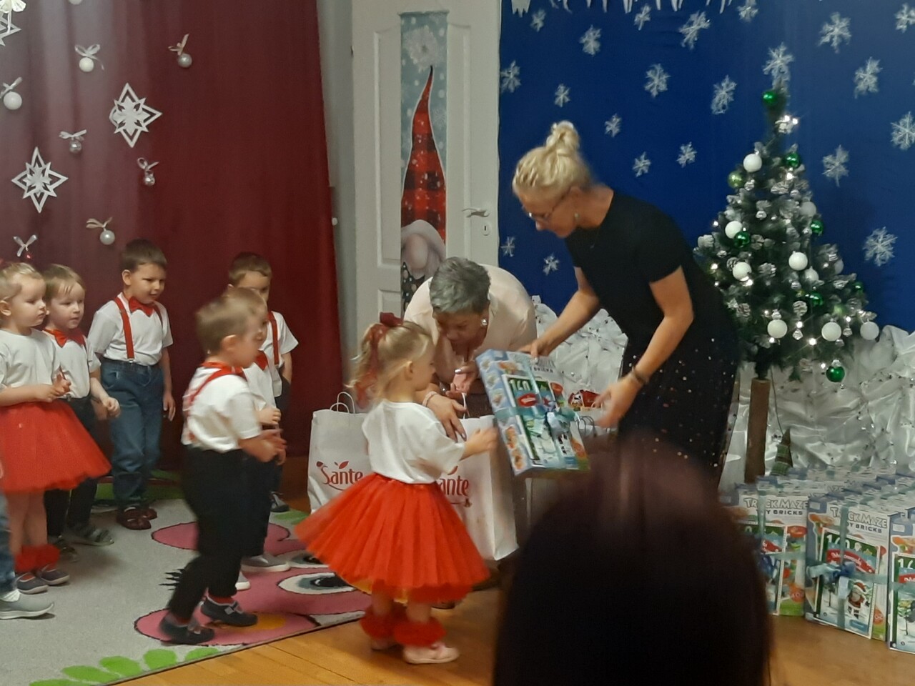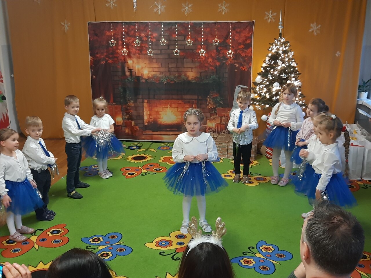 Przy kojących dźwiękach kolęd, a nawet skaczących iskier z rozgrzanych do czerwoności kominków, każda grupa przyjęła miłych gości. Po wspaniałych prezentacjach nadszedł czas na piękne, świąteczno- noworoczne życzenia ze strony Pani Dyrektor. Przy tej okazji każdy przedszkolak został obdarowany świątecznym prezentem- zakupionym dzięki wsparciu Rady Rodziców.
